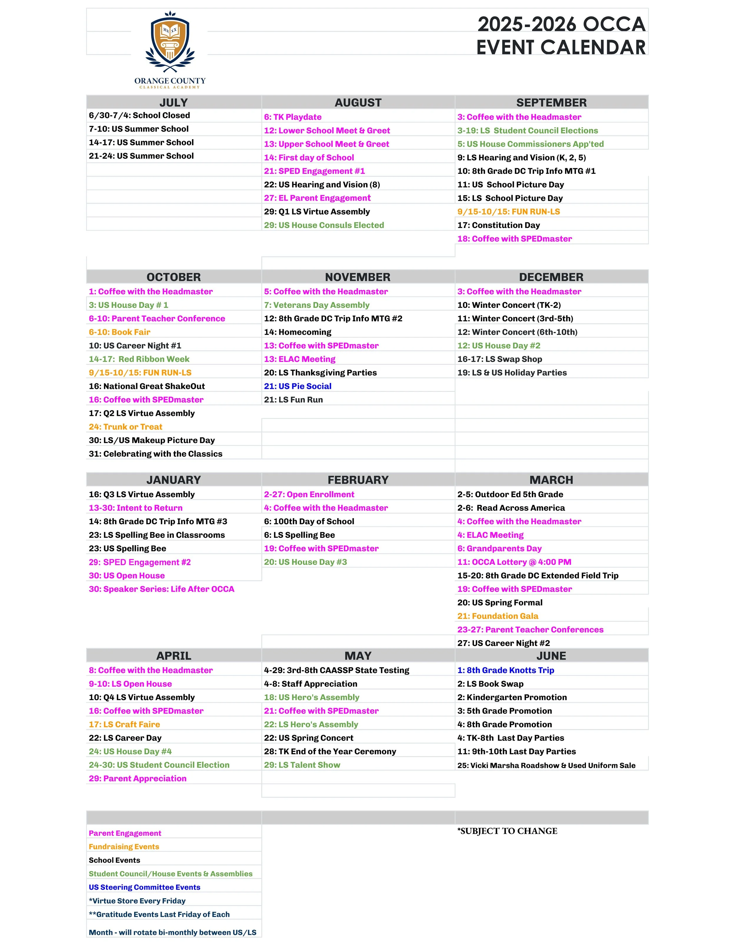 2025-2026 OCCA School Events Calendar